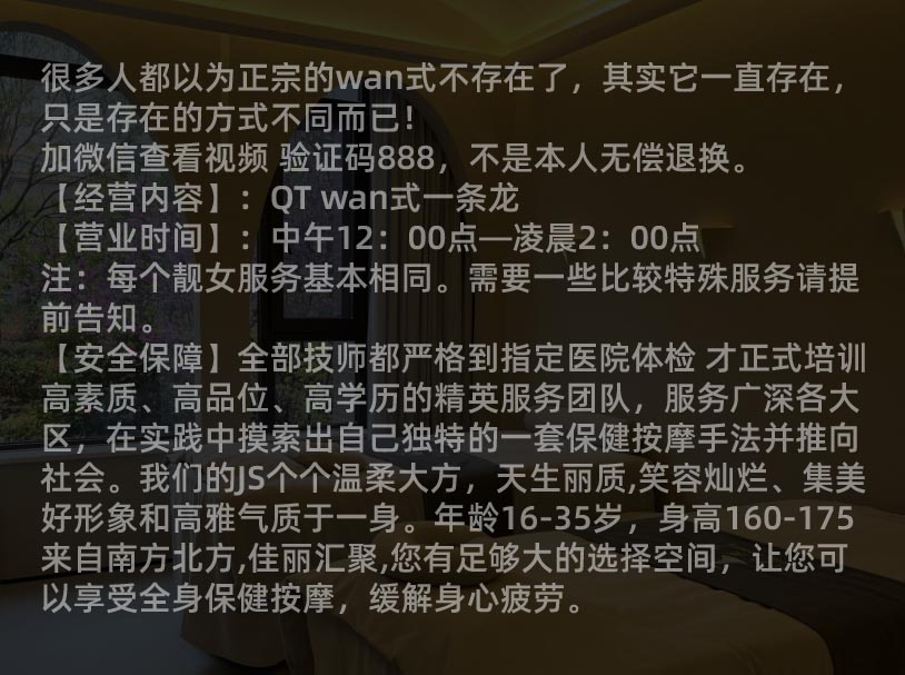 生活累了,不要放弃,不要沮丧,来展开一场邂逅吧。中式古典风格私人会馆,给您帝王级的服务感受,带您体验穿越古今,流连忘返!是您个人体验、商务招待的不二之选。在独倚西窗,看月光洒落花前。月光皎皎,美丽温婉,舞者月下起舞,素衣翩翩。迎客松间照,清泉石上流,曲径通幽处,琴棋书画情,品景、品酒、品人,尽在。本店是一所技术专业的高档SPA会所,为您提供高档SPA理疗服务项目,全过程由技巧高超的漂亮美女舞者为你服务,本会所一直以真心实意看待每一位新老顾客,志向于为顾客出示令人满意的服务项目,您的满意与笑容,是我们始终的追求。会所专业水疗十几年沉淀,帮助现代人缓解精神紧张,重新找到精神焕发的状态,远离熬夜带来的伤害。